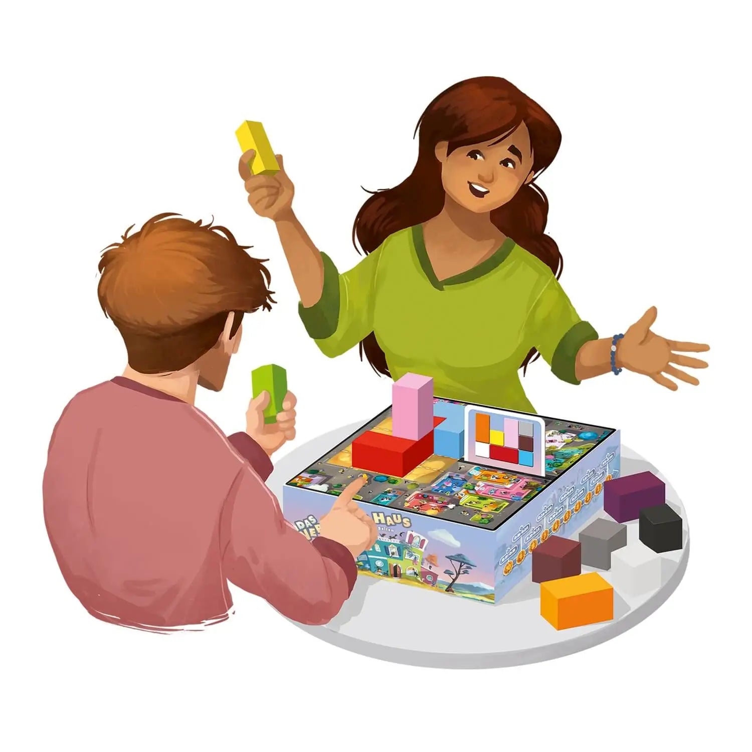 Bereit für die ultimative Bau-Challenge? In wechselnden Teams bauen jeweils zwei Spieler ein Haus, ein verrücktes Haus. Jeder Spieler sieht nur von einer Seite, wo welcher Stein wie verbaut werden muss. Als wäre das nicht genug, tickt die Uhr in der stimmigen Timer-App und das Team muss noch möglichst schnell bauen - wird schon schief gehen! Um im Bau-Tohuwabohu den Durchblick zu behalten, ist clevere Kommunikation und gutes Teamwork gefragt. Das verrückte Haus ist ein Bau- und Geschicklichkeitsspiel voller Action für alle Generationen!
