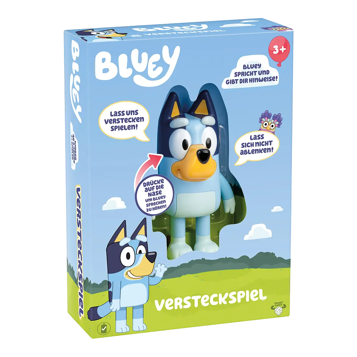 Hol dir mit dem Versteckspiel von Bluey den fantasievollen Spielspaß direkt zu dir nach Hause! Mit dieser niedlichen, interaktiven, elektronischen Figur können Kinder mit Bluey bei sich zu Hause richtig Verstecken spielen. Verstecke Bluey und drücke ihre Nase, um den eingebauten Timer zu starten. Bluey spricht und kichert alle paar Sekunden, um dir zu helfen, sie zu finden. Ob die Kinder sie wohl finden, bevor die Zeit abgelaufen ist? Die erste Person, die Bluey findet, gewinnt! Wenn ein Mitspieler Bluey gefunden hat, kann erneut auf ihre Nase gedrückt werden. Das aktiviert den „Tanzmodus“ und alle Kinder können zum Titelsong von Bluey tanzen.