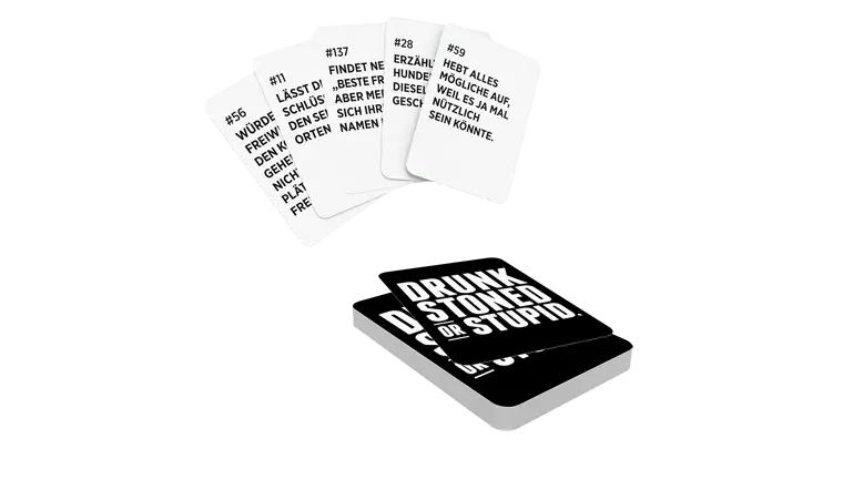 Je mehr Spieler Drunk, Stoned or Stupid spielen, desto besser. Im Ernst. Und je verrückter die Spieler sind, umso mehr Spaß werdet ihr haben. Aber Achtung, dieses Spiel ist nichts für Angsthasen. Drunk Stoned oder Stupid ist ein hochexplosives Partyspiel, bei dem ihr viel über die Macken eurer Mitspieler und so manch gut gehütetes Geheimnis erfahrt. Pro Runde schlüpft ein Spieler in die Rolle des Richters, zieht eine Karte und liest die darauf stehende Aussage laut vor. Die Aussage könnte beispielsweise lauten „Hebt alles Mögliche auf, weil es ja mal nützlich sein könnte“. Alle anderen Spieler überlegen jeweils, zu wem die Karte ihrer Meinung nach am besten passt, und erklären, warum das so ist. Nachdem alle ihre Wahl begründet haben, entscheidet der Richter, wer die Karte bekommt. Sobald jemand sieben Karten vor sich liegen hat, endet die Partie und dieser Spieler ist der Loser. Bei Drunk, Stoned or Stupid gibt es einfach keine Gewinner.