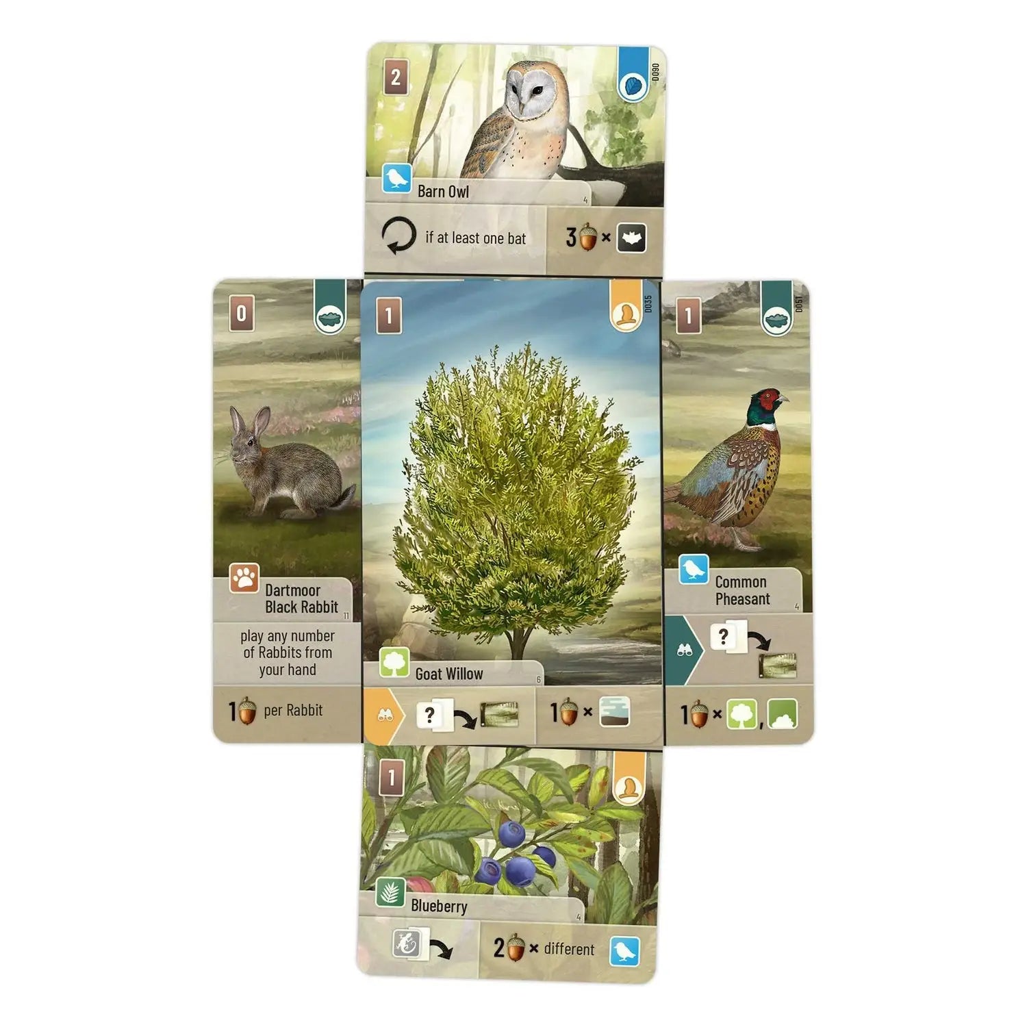 What's new in Dartmoor is the introduction of TERRAIN cards that are played horizontally and serve as a home or feeding ground for different species than trees or shrubs. Due to the nature of the terrain, species can only be placed above and below a terrain card. Deer and other species stay clear from bogs or peat areas in the moorland. They need their drink, but won't feel safe at dwells or next to rivulets. So players have to be watch out, where to place their species.