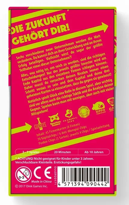 Startups ist die neue und verbesserte Version eines älteren Oink Games, welches 2015 herauskam und bei der Messe Game Market in Tokyo den zweiten Preis gewonnen hat: Rights.Jeder Spieler schlüpft in die Rolle eines Investors und versucht in mindestens eine der sechs...... Show more