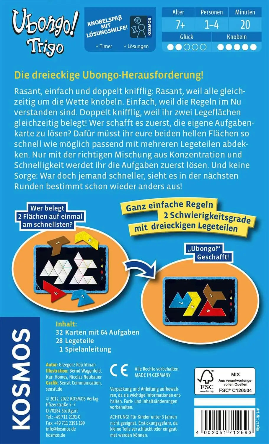 Der beliebte Ubongo-Spaß im Zeichen des Dreiecks – rasant und neuartig knifflig! Eine Fläche zu belegen ist nicht genug? Kein Problem: Jetzt füllt jeder Spieler zwei Puzzleflächen gleichzeitig! Mit etwas Knobeln schafft das jeder – aber wer wird der Schnellste sein? Die dreieckigen Formen stellen eine neue Herausforderung dar, die alle fesseln wird. Die Regeln bleiben dabei gewohnt einfach. Bis zu vier Spieler können gegeneinander antreten – zwei Schwierigkeitsstufen sorgen für einen leichten Einstieg und lang anhaltenden Spielspaß!