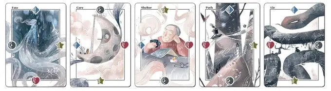 When no story cards remain, it's time to say goodbye. There's no more time for stories. The person leaving says the words on the Goodbye card, then gets up and leaves. After a short break, get back together. Reveal the cards left on your hands. Those are the things left unsaid. Look at them together one by one, and silently reflect on their meaning, on how you wish you had just a little more time together. If you both had the same amount of cards in your hands, you at least feel you were on the same page, and your final conversation was in sync, like the good old days.