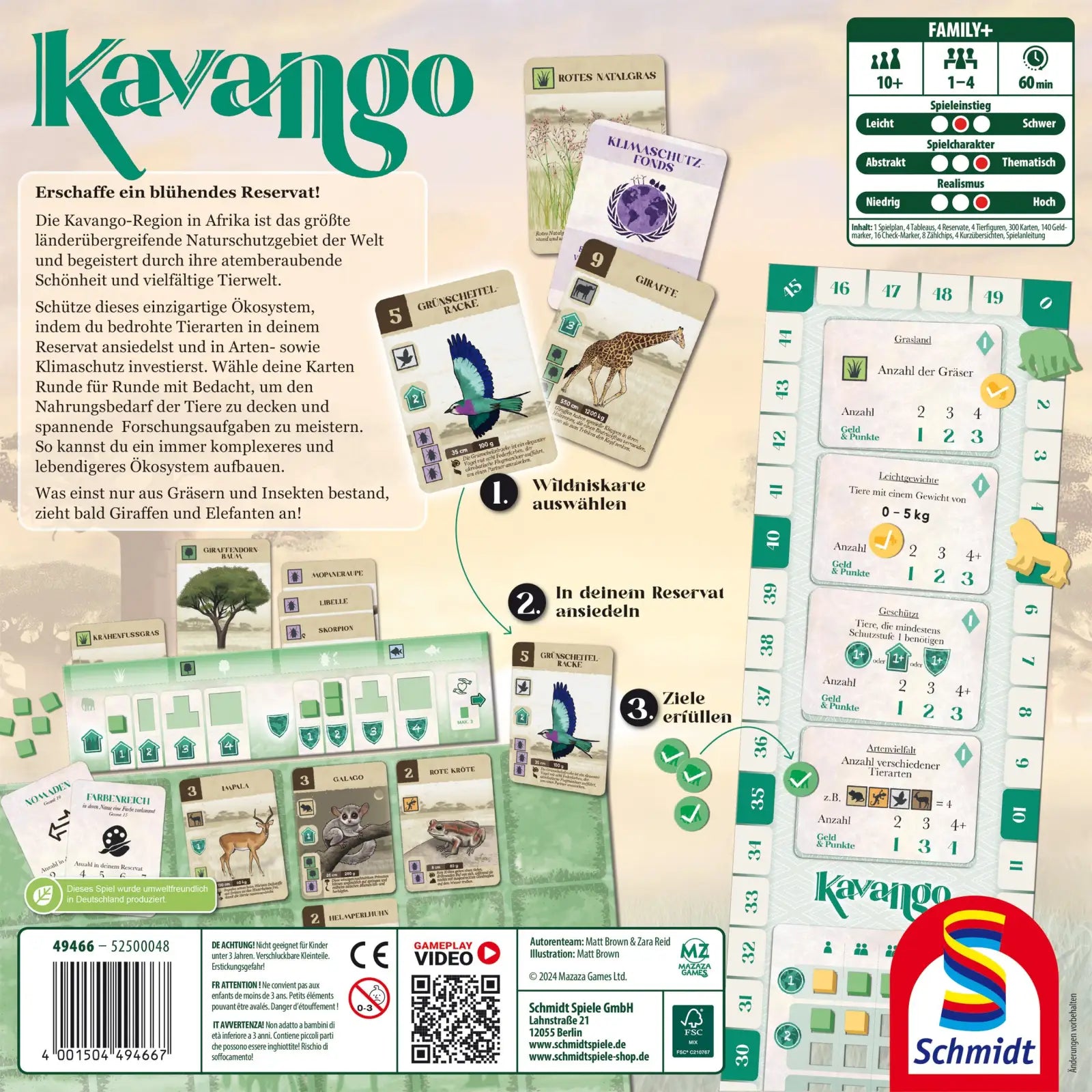 Ein bis vier Personen ab zehn Jahren gestalten im Karten-Strategie-Spiel „Kavango“ in drei Runden ihr eigenes Naturreservat. Dabei werden Pflanzen- und Tierarten angesiedelt, Lebensräume erweitert und Forschungsaufgaben erfüllt. Wer clever vorgeht und gezielt haushaltet, kann mit den erwirtschafteten Mitteln bedeutende Beiträge zum Klima- und Naturschutz leisten, was sich nicht nur im Spielverlauf, sondern auch in der Endwertung auszahlt.
