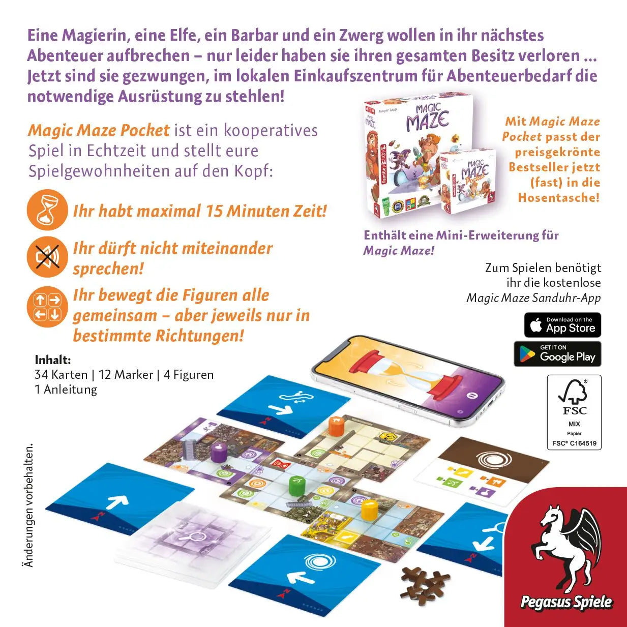 aber können sie ihn auch umsetzen?Magic Maze Pocket ist ein kooperatives Echtzeitspiel, bei dem eine Partie weniger als 15 Minuten dauert und sich durch das kompakte Format ideal zum Mitnehmen eignet. Gemeinsam bewegen die Spielenden ihre Held*innen durch das Labyrinth. Jede*r Mitspielende*r hat dabei die Fähigkeit, jede beliebige Figur genau eine konkrete Aktion (z.B. nach Norden gehen, die Rolltreppe nutzen) ausführen zu lassen. Schaffen es alle Abenteurer*innen, das Einkaufszentrum innerhalb der vorgegebenen Zeit zu verlassen und dabei jeweils einen ganz bestimmten Gegenstand zu stehlen, gewinnen alle gemeinsam. Doch dazu müssen sich die Spielenden gut abstimmen, ohne dabei zu kommunizieren.