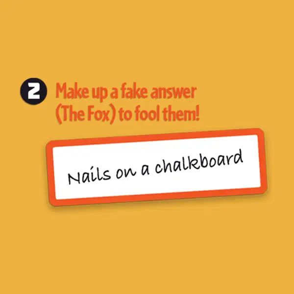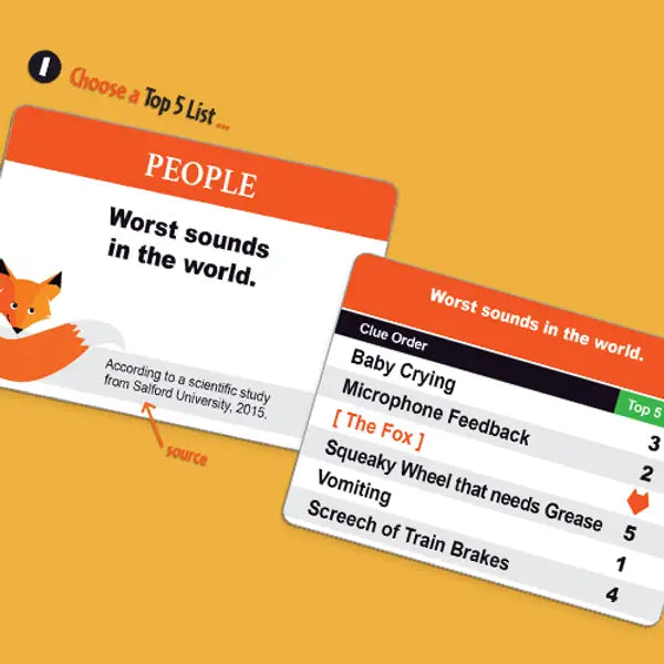 Each Round one player is the FOX. They will choose a Top Five list card category, examine all the answers and then make up an answer they think the group will rank as one of the Top Five answers.