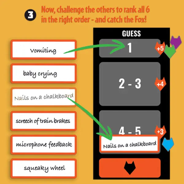 Player will all get one point for each correctly ranked answer and the Fox will gain a number of points based on how high the other ranked their answer as one of the Top Five... BUT before the correct rankings are revealed, the other players will take their colored token and place it on the one answer they PERSONALLY feel best about. Maybe they disagreed with the concusses at the table. You can even place your token on the answer you think was made up. If you are right, you get three bonus points.